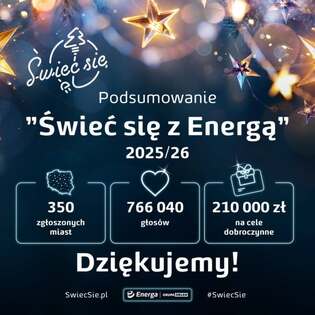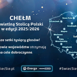 Znamy zwycięzcę ogólnopolskiego plebiscytu „Świeć się z Energą”. Tytuł Świetlnej Stolicy Polski 2025/2026 otrzymuje Chełm, który w finałowej rywalizacji zdobył 143 576 głosów internautów, pokonując 15 innych konkurentów – mistrzów etapu wojewódzkiego. W zabawie wzięło udział 350 miejscowości z całej Polski. Każdy z 16 finalistów otrzyma, dzięki akcji Grupy Energa, vouchery na zakup energooszczędnego sprzętu AGD dla potrzebujących.